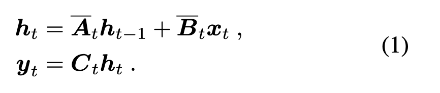 여기서 T는 시퀀스 길이, xt,yt∈RD 는 시간 t에서의 입력과 출력, ht∈RH는 x=<t 히스토리를 요약한 hidden state입니다. 핵심 포인트는 행렬 At,Bt,Ct 가 장기 의존성을 얼마나 잘 모델링하느냐인데, 만약 이 행렬들이 시간에 따라 고정(time-invariant)이라면 시간마다 연산식이 똑같아져 재귀를 순차적으로만 할 필요가 줄어들고 병렬화가 쉬워져 학습/추론 효율이 좋아집니다.