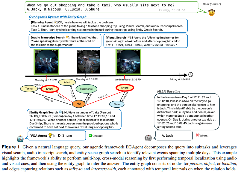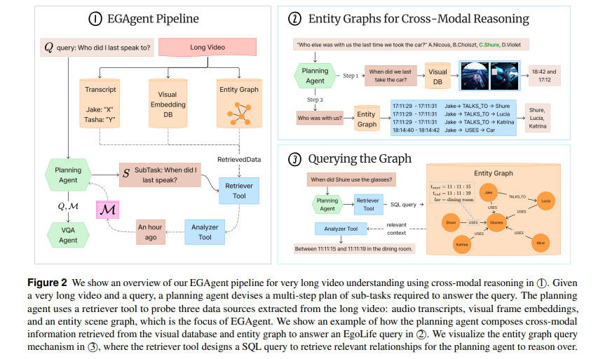 EGAgent의 planning agent가 이 entity graph를 검색하고 추론 할 수있도록 하는데 이때 visual search tool (SQL + semantic search hybrid)과 audio transcript search tool을 사용하도록 합니다. EGAgent의 흐름을 한마디로 설명하자면 비디오에서 엔티티-관계 그래프를 만들고 플래닝 에이전트가 그래프 검색,비주얼 검색, 오디오 캡션 검색을 조합해서 여러 날에 걸쳐진 정보를 모아 multi-hop reasoning을 진행합니다.