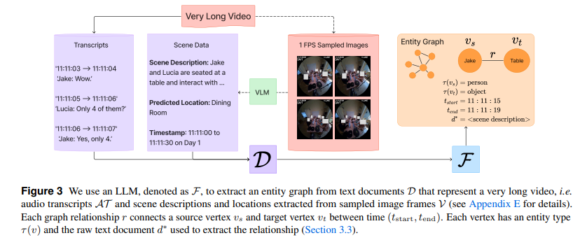 먼저 Entity Graph Representations단계입니다. 엔티티 그래프(G=(V,E))는 노드V와 엣지E로 구성되어있습니다. fig3처럼 텍스트 문서집합 D(오디오전사, 장면설명, timestep을 포함함)로부터 엔티티 그래프 G=(V, E)를 구성합니다. 이때 이 시간정보를 통해 해당 관계의 존재 여부나 순서, 지속시간 같은 것들을 추적할수 있게 되고 이 덕분에 긴 시간 범위에서 반복되는 사건이나 상호작용들을 추론할수 있게 됩니다.