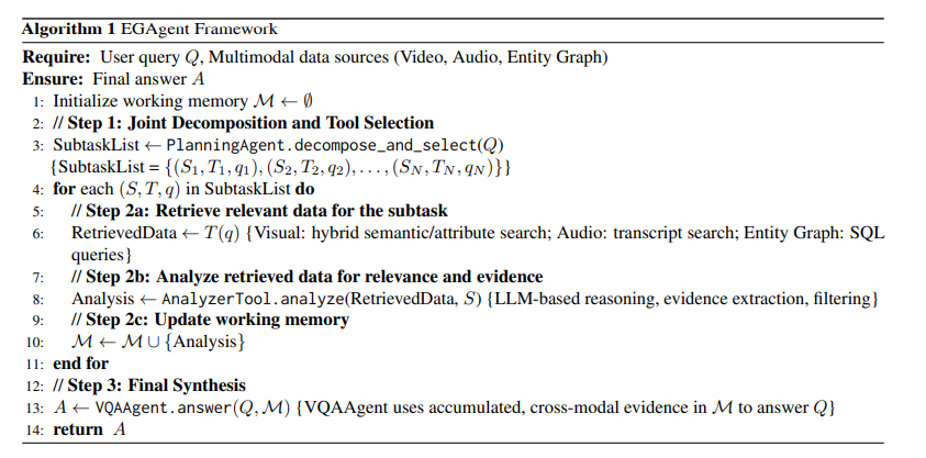 다음으로는 EGAgent 프레임워크를 살펴보겠습니다. 위의 EGAgent 알고리즘 흐름을 간단히 말하자면 쿼리를 Subtask로 나누고 각 서브테스크의 (Si, Ti, qi)에 대해 Ti(qi)로 검색 수행하고 → Analyzer가 결과 분석하고 → 분석 결과를 Working Memory M에 추가하는 과정을 반복한 후 → 최종으로 VQA Agent가 원래 질문 Q와 누적된 Working Memory M을 입력으로 받으 최종 답변 A를 생성합니다