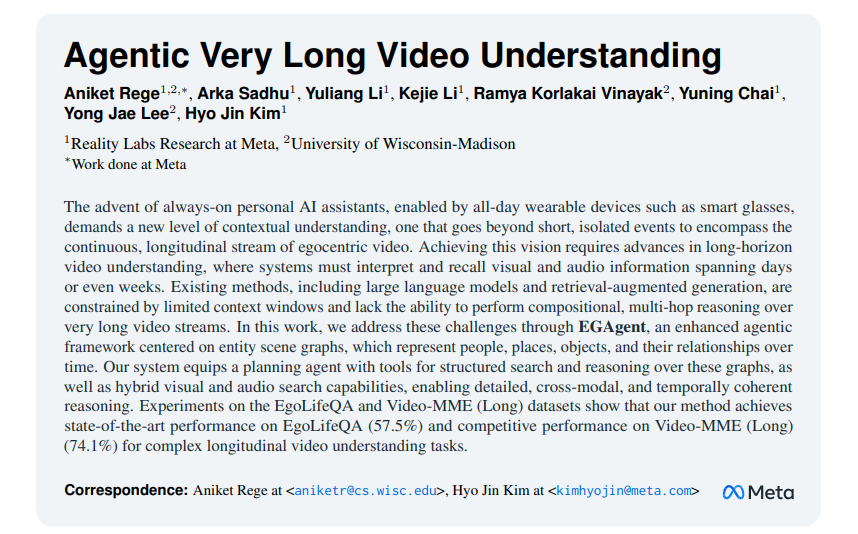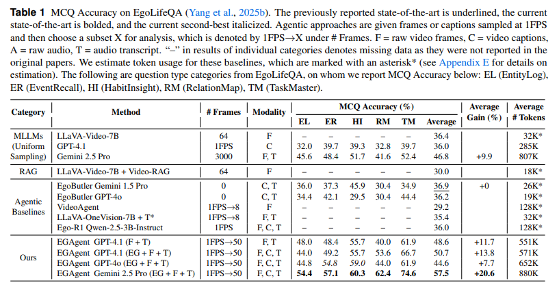 • entity graph와 시각/오디오 검색 도구를 함께 쿼리로 넣어주는 agentic framework를 통해 EgoLifeQA에서 이전 SOTA 대비 높은 성능을 달성한다