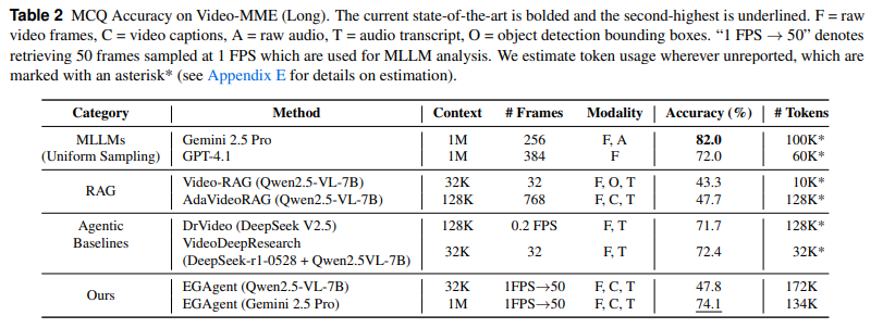 저자들은 very long video understanding에 초점을 맞춘 두 벤치마크(EgoLifeQA, Video-MME (Long))에서 평가를 진행했습니다.