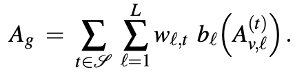 여기서 b는 d차원의 1 x 1 conv layer와 global average pooling으로 이루어져있고, w는 학습되는 가중치로 softmax를 취합니다.