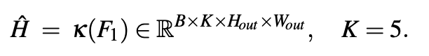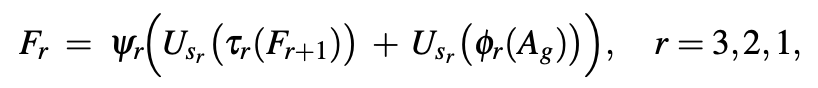 식은 위와 같은데요. 파이 기호는 1 x 1 conv layer로 각 단계의 채널 수는 256, 128, 64라고 합니다. U는 bilinear upsampling이며 목표 해상도는 (h, w) -> (2h, 2w) -> (H, W)라고 합니다. 프사이 기호는 3 x 3 conv layer입니다. 그리고 초기 F4 = 0으로 두고 계산한다고 하네요.