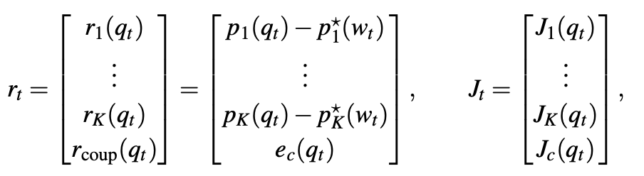 논문에서는 q를 arm – hand joint 값으로 두고 FK와 FK의 Jacobian을 구합니다. 그리고 위치에서의 목표값을 위와 같이 Pstar로 정의했기 때문에 우리는 현재 p값과 pstar값의 잔차를 최적화 하면 됩니다.