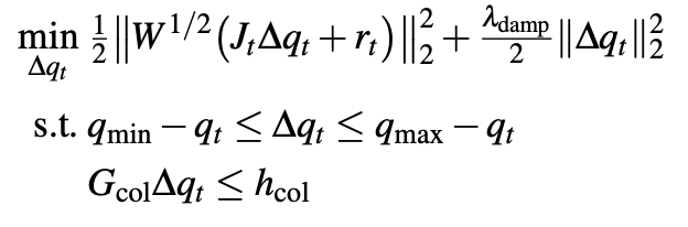 최적화 방식은 위와 같은데 밑의 제약 조건을 가지고 위의 식을 최적화 하는 방식입니다. 첫번째 제약은 joint값의 한계, 두번째는 self-collision과 같은 충돌 회피 제약입니다. 논문에서는 매 step step마다 FK를 다시 계산하여 동작 연속성과 singular point를 예방한다고 하네요.