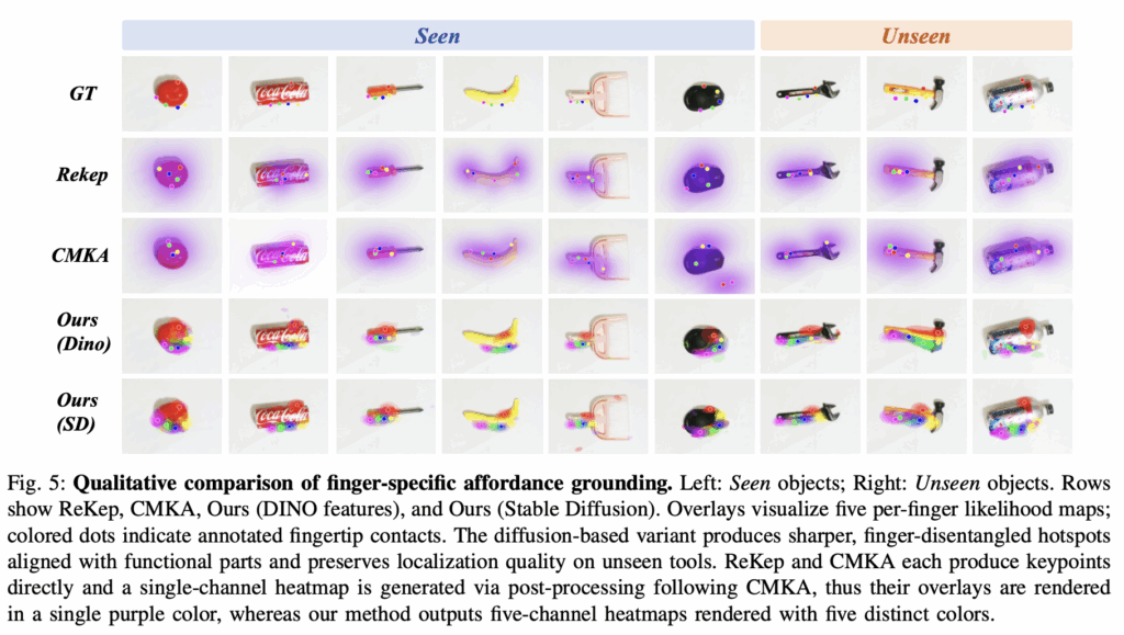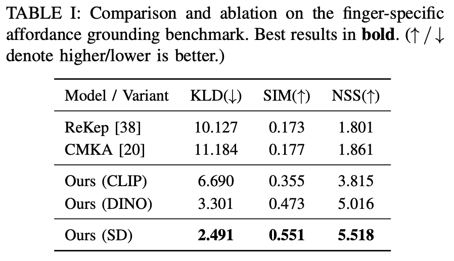 논문에서는 VLM을 사용하여 직접적으로 손가락별 affordance를 예측한 prior 연구가 없어서 유사한 ReKep과 CMKA를 baseline으로 두고 실험을 진행하였다고 합니다. 결과적으로 좋은 성능을 보였습니다. 그리고 diffusion model을 사용하지 않고 CLIP과 DINO를 사용하여 실험을 진행하였을 때 성능이 떨어진 것을 보아 text-to-image diffusion model을 사용하는 것이 affordance를 예측하고 이해하는데 도움이 된다는 것을 보여줬습니다.