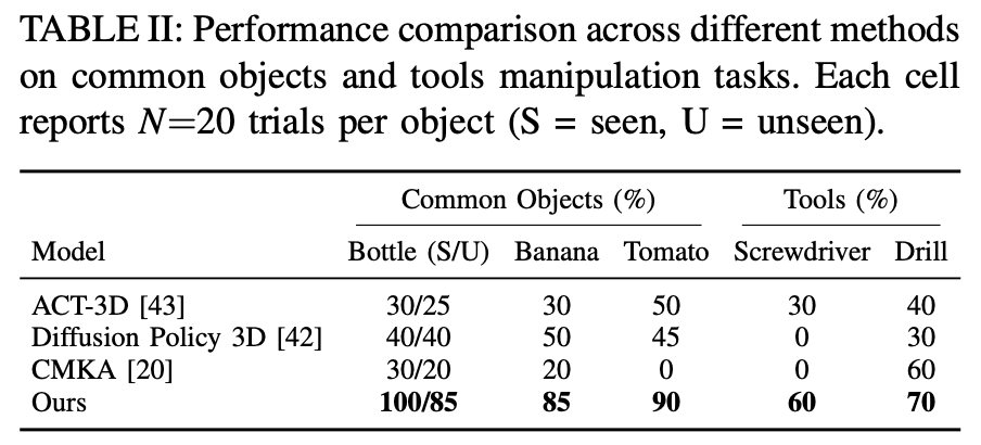 2026년 논문이기도 하고 위와 같은 방식이 downstream manipulation policy 앞단에 사용되는 연구는 찾아보고 있다면 리뷰하도록 하겠습니다!! 뭔가 inference time이 매우 오래걸릴 것 같은 생각이 드네요!