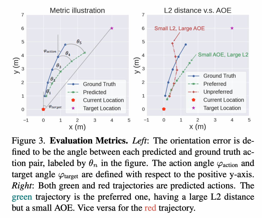 fig 3에서 오른쪽 예시처럼 빨간 traj 가 초록 traj 보다 L2 오차는 더 작을 수는 있어도 실제 목표 방향에서는 더 많이 벗어난 방향으로 움직일 수도 있기 때문에 저자들은 예측 action과 gt action 사이의 각도 차이를 기반으로 하는 AOE 평가를 활용합니다.