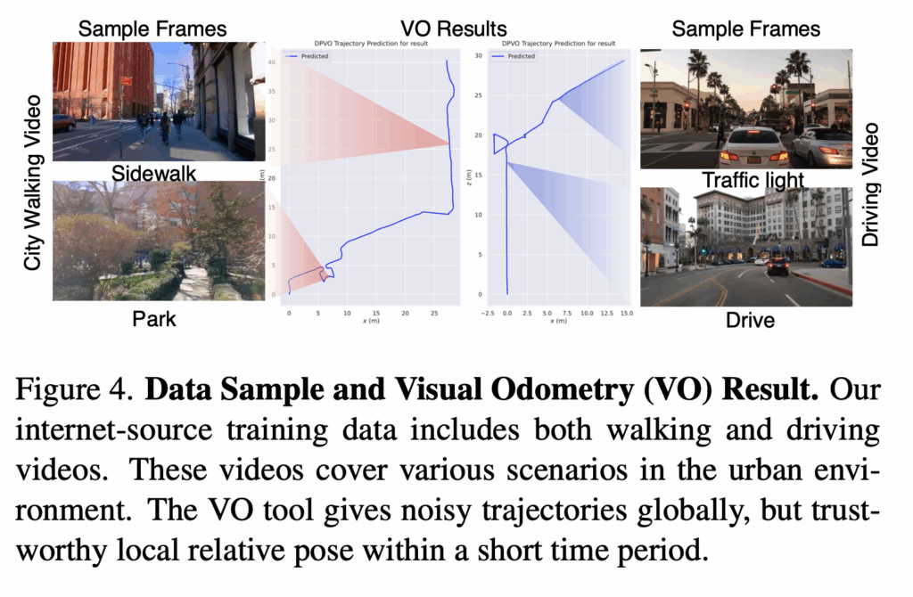 위 예시를 보면 실제로는 주행 비디오의 traj 가 보행 비디오보다 더 길어야 맞는데 DPVO 출력에서느 오히려 더 짧게 나타날 수 가 있습니다. 따라서 자자들은 이러한 문제를 해결하고자 GNM 연구를 따라서 각 traj 내 평균 step length 로 각 action을 정규화를 함으로써 VO의 스케일 모호성 문제를 해결하고자 하였고 결과적으로 모델은 일관되고 추상화된 action space에서 policy를 학습할 수 있게된다고 합니다.