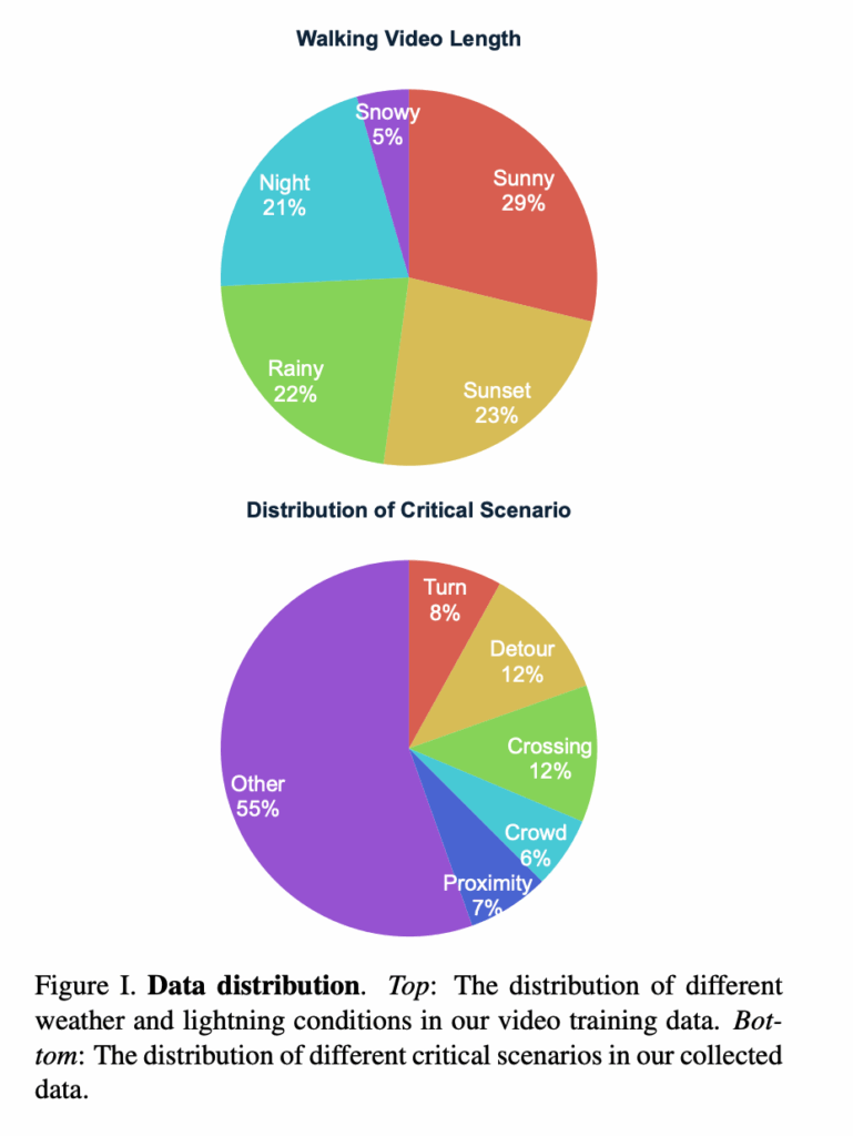 저자들은 인터넷에서 수집한 city walking 비디오(1인칭 시점-person view)를 활용합니다. 이러한 비디오들은 보행자와의 상호작용, 교통 신호 준수, 다양한 장애물 회피와 같은 동적인 도시환경을 내비게이션 할 때의 복잡성을 자연스럽게 담고 있다고 합니다. 따라서 저자들은 다양한 날씨, 조명 조건을 포함하는 2000시간 이상의 도시 보행 비디오 데이터셋을 구축합니다.