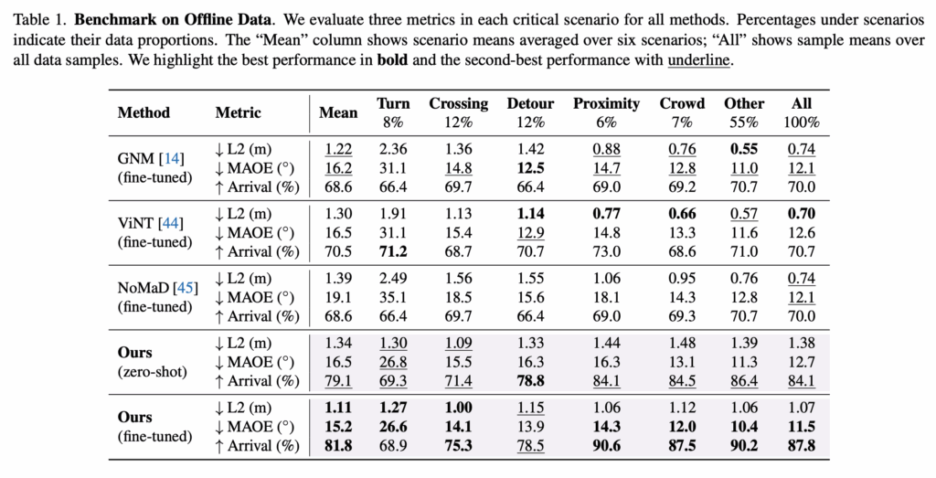 위는 각기 다른 핵심 시나리오에서의 벤치마크 결과를 보여줍니다. 전반적으로 저자들의 fine-tuned 모델은 detour를 제외한 모든 시나리오에서, 대부분 우수한 성능을 보입니다. 저자들은 detour 시나리오에서 상대적으로 성능이 덜 좋은 이유를, 웹 비디오 학습 데이터에서 detour에 해당하는 데이터 비중이 작기 때문이라고 추정합니다. 그리고 여기서 저자들의 -shot 모델이 fine-tuned된 베이스라인들과 비교해 성능이 비슷하거나 심지어 더 좋다는 점을 어필하는데, 학습 데이터가 인간 보행 비디오이고, 실제 배치는 로봇(도메인 갭)이고 입력 모달리티/환경 차이도 존재한다는 점을 고려하면, 대규모 사전학습의 효과가 크는 것을 보여준다고 주장합니다.