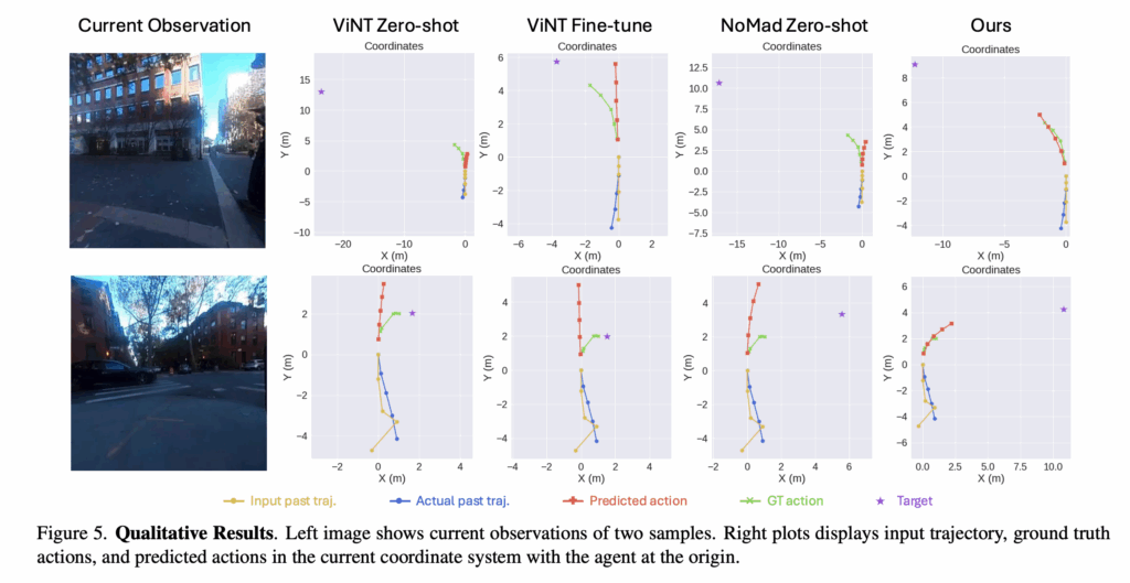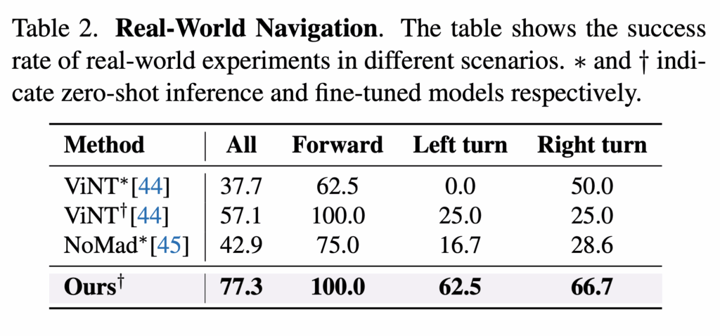 저자들이 제안한 모델을 저자들의 연구 설정과 관련있는 outdoor navigation 모델들(GNM, ViNT, NoMaD)과 비교합니다. 이 방식들은 image goal navigation이라 저자들은 수집한 데이터에서 얻은 goal image를 사용해서 입력 goal 모달리티만 바꾼 상황에서 동일한 방식으로 테스트를 진행했다고 합니다.