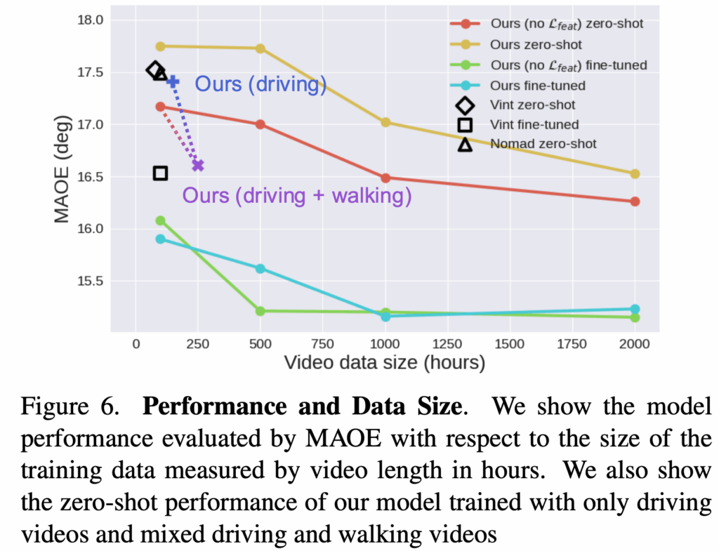 저자들은 Q2.학습 데이터 셋의 크기를 늘리면 도시 내비게이션 모델의 성능이 어느정도 까지 좋아지는지에 대한 답을 하기 위해서 학습 데이터의 크기를 비디오 길이(hours)로 측정하고, 그에 따른 모델 성능을 MAOE 기준으로 평가한 결과를 제시합니다. 위 그래프는 학습 데이터 양이 증가할수록 저자들의 zero-shot 성능이 향상되는 결과를 보입니다. 특히 1000시간 이상의 비디오로 학습했을 때 저자들의 zero-shot 모델(빨간 선) 이 fine-tuned ViNT 모델(□) 보다 더 좋은 성능을 달성하는 결과를 보입니다.