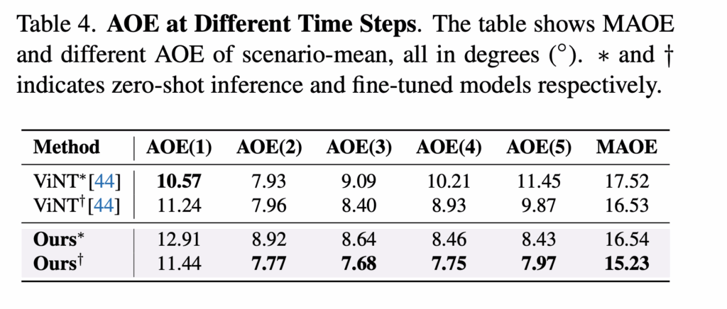 Q3. 파이프라인의 각 구성요소가 실제 도시 내비게이션에서 모델의 성능과 신뢰성을 어떻게 향상시키는가?에 대한 답을 하기 위해서 저자들은 위 테이블 처럼 서로 다른 시간 step에서의 AOE, k=1부터 k=5까지의 AOE(k) 를 분석합니다. ViNT는 예측 step이 진행될수록 orientation error가 증가하는 모습을 보이지만 저자들의 방법론은 2번째 step 부터 5번째 step까지 AOE가 비교적 일정하게 유지되는 모습을 보입니다.