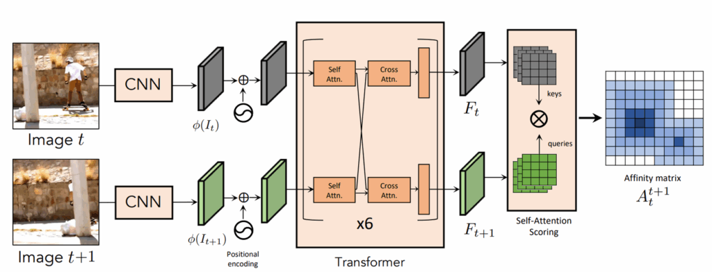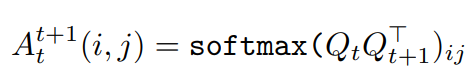 t프레임과 t+1 프레임에 대한 시각적 토큰들의 집합을 각각 Q_{t}, Q_{t+1} 라고 할 때, 각 시각적 토큰들에 대하여 내적을 한 다음에 softmax를 취한 것을 저자들은 transition matrix라고 본 것이죠. 저희한테는 두 프레임에 대한 cross-attention map으로 쉽게 해석되겠지만 2020년 당시에는 비전 분야에서 attention map이라는 개념이 잘 도입되지 않았던 터라 저자들은 transition matrix로 표현한 것은 아닐까라는 생각이 드네요.
