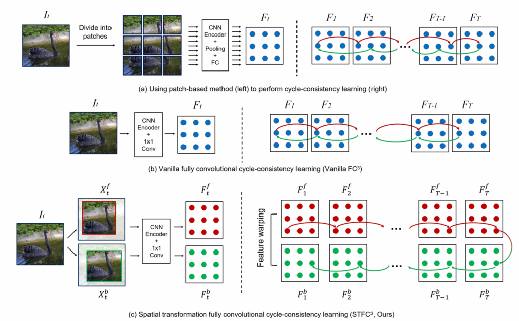 CRW 논문 이후로 21년도에 ICCV workshop에 STFC라는 논문이 등장했습니다. 해당 논문은 CRW가 학습 때 입력 이미지 단에서 crop을 한다음에 각 crop된 영상을 Encoder의 input으로 사용한다는 점이 추론 단계에서 전체 이미지를 보는 것과 상이하다는 점을 문제로 삼았습니다.