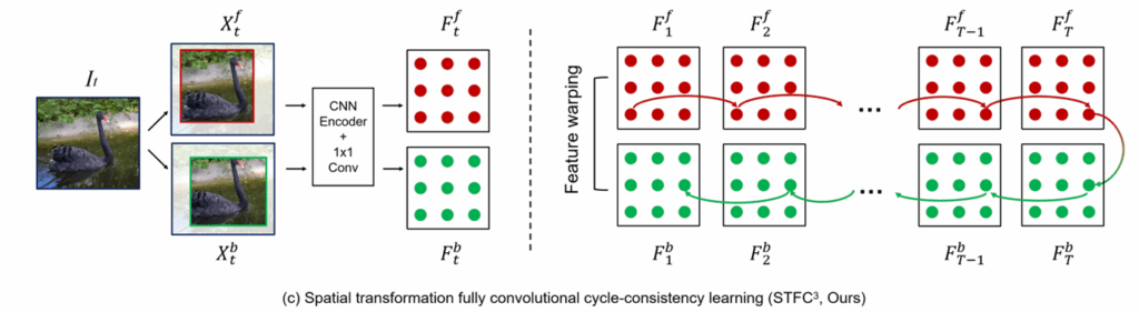 우선 STFC와 동일하게 t 프레임 시작 이미지와 t+1 target image에 대하여 동일한 random crop을 적용한 foward image들과 다른 random crop을 적용한 backward image를 생성합니다. 그렇게해서 각각 foward 전이 행렬과 backward 전이행렬을 계산하게 되는데, 여기서 STFC가 제안하는 feature warping 과정을 거치지 않으면 GT 값으로 identity matrix를 사용할 수 없게 된다고 말씀드렸습니다.