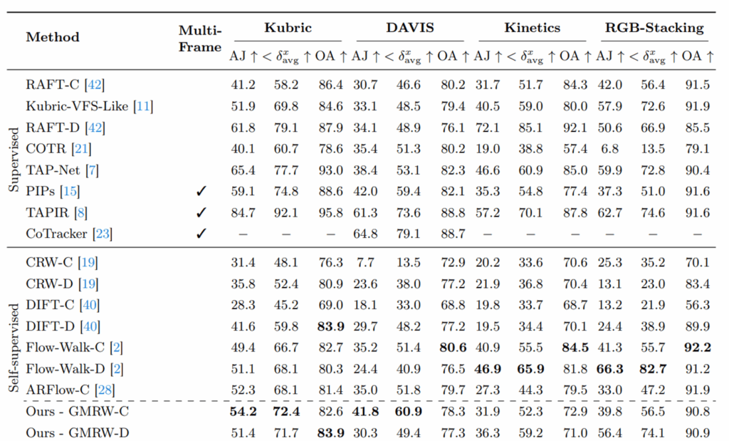 우선 저자들은 4가지 데이터셋에 대해서 성능을 리포팅하는데, 저자들의 방법론은 GT 없이 학습을 하는 self-supervised 방법론이기 때문에 supervised 방법론들과 성능을 비교하기는 어렵습니다. self-supervised 방법론들과의 비교를 살펴보면 저자들의 베이스라인 방법론이었던 CRW와 Flow-Walk은 모두 foward/backward cycle 전이 행렬 학습 방식을 사용한 방법론으로 생각하시면 되고 DIFT는 stable diffusion 모델 기반 특징 매칭 방식입니다.