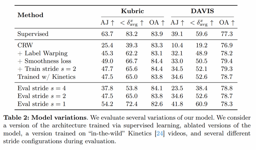 다음은 ablation 실험입니다. 저자들의 GMFlow 모델 구조로 지도학습을 할 때의 성능이 제일 위의 행에 대한 성능으로 upper bound라고 생각하시면 됩니다. self-supervised 관점에서 베이스라인인 CRW를 적용하였을 때 성능이 대폭 감소하는 것을 볼 수 있는데, 이는 CRW 학습 방식은 shortcut을 발생시켜 유의미한 대응 관계를 학습하지 못하기 때문으로 볼 수 있습니다.