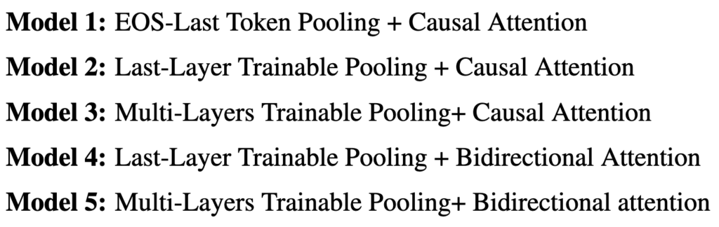 이 조합에서는 EOS pooling과 bidirectional attention 조합이 빠져있습니다. 이러한 이유는 bidirectional attention 구조에서는 EOS 토큰이 특별한 의미를 갖지 않습니다. 왜냐하면 모든 토큰이 서로를 볼 수 있기 때문에 마지막 토큰이 전체 문장을 대표한다고 볼 수 없기 때문입니다. 그래서 기존 연구들에서도 bidirectional attention을 사용할 때는 mean pooling 이나 trainable pooling 같은 방법을 사용하는 것이 일반적입니다. 따라서 이 조합 역시 실험에서 제외되었습니다.