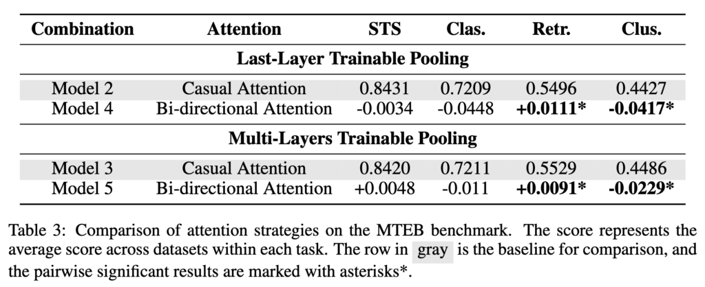 반면 동일한 설정은 clustering task에서는 오히려 성능 감소로 이어졌습니다. 이러한 결과는 bidirectional attention이 양방향 문맥 정보를 모두 활용할 수 있기 때문에 관련 정보를 찾는 retrieval task에는 도움이 되지만, 동시에 추가적인 문맥 정보가 noise로 작용하여 clustering task에서는 오히려 성능을 저하시킬 수 있다고 저자는 설명하고 있습니다.