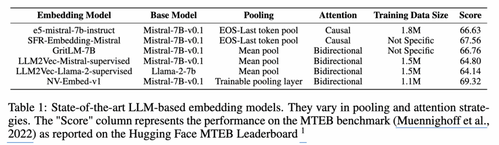 표 1은 LLM 기반 임베딩 모델들을 나열하고 있습니다. 현재 다양한 LLM 기반 임베딩 모델들이 제안되고 있지만, 어떤 모델은 다른 모델보다 더 좋은 성능을 보입니다. 그렇다면 자연스럽게 “임베딩 모델의 성능을 결정하는 요소는 무엇인가?”와 같은 질문이 생깁니다. 예를 들어 다음과 같은 요소들이 영향을 줄 수 있습니다.