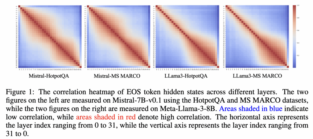 각 입력 문장에 대해 레이어별 EOS 토큰 hidden state를 추출하고, 서로 다른 레이어 간의 Spearman correlation coefficient를 계산했을때의 실험 결과는 Figure 1의 heatmap으로 나와있습니다. 결과를 보면 다음과 같은 특징을 확인할 수 있습니다.