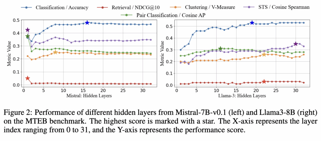 결과는 Figure 2에 나타나 있습니다. 그림을 통해서 알 수 있듯이 마지막 레이어의 hidden state가 항상 최고의 성능을 보이는 것은 아닙니다. 예를 들어 Mistral-7B에서는 초기 레이어가 오히려 더 많은 의미 정보를 담고 있는 경우도 있고 Llama3 모델에서는 중간 레이어가 의미 정보를 표현하는 데 더 효과적인 것으로 나타났습니다.