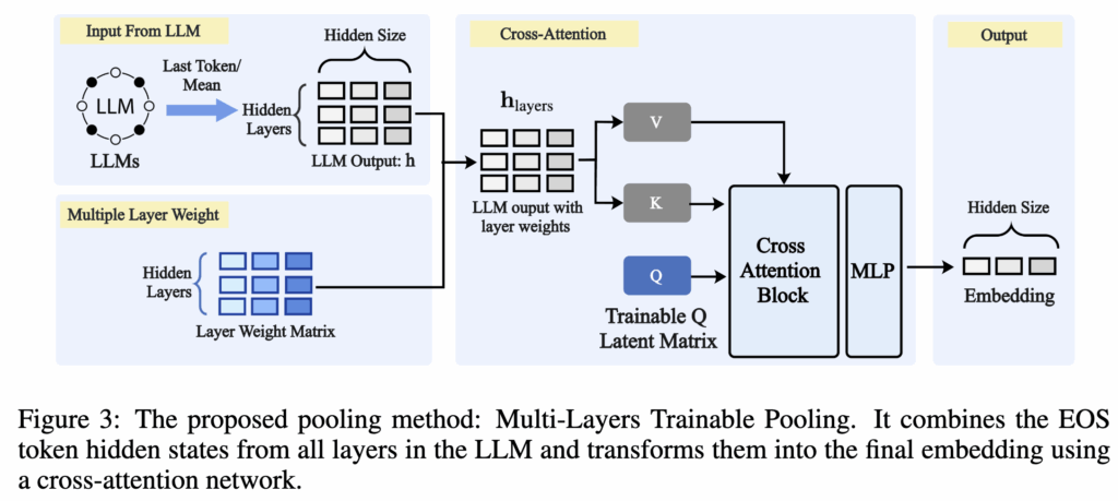 앞선 실험 결과를 바탕으로 저자는 Multi-Layers Trainable Pooling이라는 새로운 pooling 전략을 제안합니다. 이 방법은 LLM의 모든 레이어 hidden state를 활용하여 임베딩을 생성합니다. 전체 구조는 Figure 3에 제시되어 있습니다.