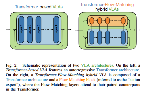저자들은 먼저 VLA를 OpenVLA와 같은 transformer-based VLA와 pi 0.5와 같은 transformer–flow-matching hybrid VLA로 구분지었습니다. 전자는 vision encoder와 language model backbone을 통해 action token을 autoregressive하게 생성하고, 후자는 transformer가 멀티모달 문맥을 처리한 뒤 action expert transformer가 conditional flow matching을 통해 연속 action trajectory를 생성합니다. 저자들은 이 둘이 구조는 다르지만, 두 계열 모두 공통적으로 transformer representation을 핵심 내부 상태로 갖고 있다는 점에서 문제를 공통된 틀로 다룰 수 있다고 합니다.