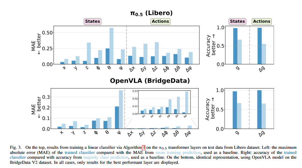 Figure 3은 저자들이 각 레이어마다 observer를 학습한 뒤, 가장 잘 되는 레이어의 결과만 뽑아서 보여준 그림입니다. π0.5는 Libero 데이터셋, OpenVLA는 BridgeData V2에서 평가했고, 위치·자세 같은 연속값은 regression probe, gripper state/action은 binary probe로 다뤘습니다. 결과를 보면 양쪽 모두 로봇의 state와 action 관련 정보가 hidden state 안에 선형적으로 읽힐 정도로 구조화되어 있다는 것입니다. 즉, VLA 내부 표현은 완전한 블랙박스가 아니라, 적어도 low-level robotic feature에 대해서는 linear observer로 복원 가능함을 보이는 실험이라고 합니다.