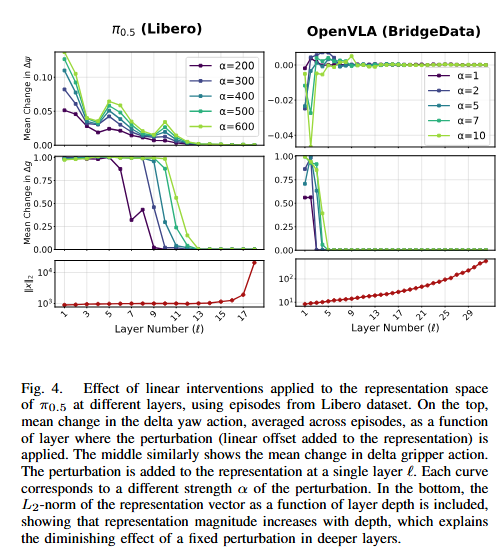 다만 pi0.5에서는 α가 커질수록 observed action change가 비교적 smooth하게 증가하지만 OpenVLA에서는 delta yaw가 robust하지 않고, delta gripper는 어느 정도 ordering은 보이지만 깔끔하지 않다고 저자들이 직접 설명합니다. 모든 모델이 똑같이 잘 제어되는 것은 아니고, π0.5 쪽이 representation-level steering에 더 잘 반응한다고 합니다. 또 perturbation 효과가 일반적으로 얕은 레이어에서 더 크고 깊은 레이어로 갈수록 약해진다고 합니다. 저자들은 깊은 레이어일수록 hidden vector 크기 자체가 커지기 때문에, 같은 크기의 변화에도 둔감하다고 합니다.