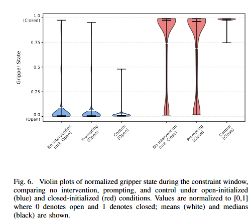 Figure 6은 closed-loop 실험의 첫 번째 결과로, gripper state(open/close) 를 제어했을 때의 분포를 보여줍니다. 결과를 보면 gripper처럼 직접적이고 간단한 low-level action feature는 representation intervention만으로도 매우 안정적으로 조정할 수 있다고 합니다.