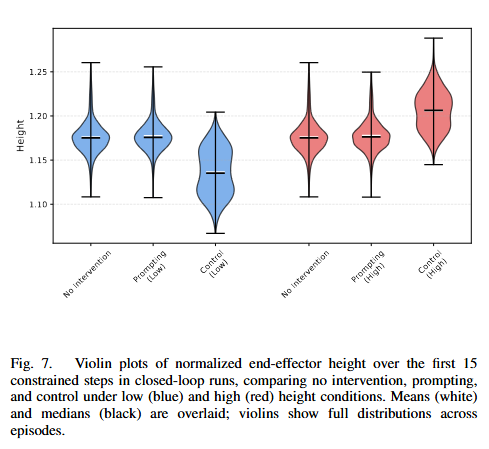 Figure 7은 end-effector height를 low / high 조건으로 제어했을 때의 분포를 보여줍니다. 저자들은 첫 15 step 동안의 normalized height 분포를 비교합니다. 결과를 보면 height steering이 효과적으로 되는것을 볼 수 있습니다. 특히 initial condition을 기준으로 더 낮게 혹은 더 높게 유지하도록 제약을 걸었을 때, control은 원하는 방향으로 분포를 명확히 이동시키는 것을 확인했다고 합니다. 그리퍼와 같은 간단한 binary feature 뿐 만 아니라 연속적인 공간적 feature도 control이 가능함을 보여주는 실험이라고 할 수 있습니다.