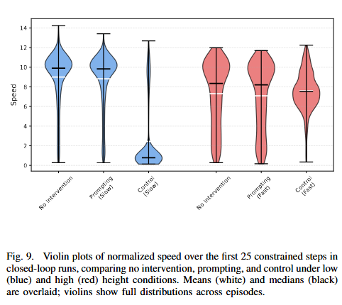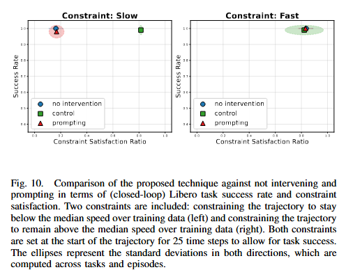 Figure 10은 speed 제어를 constratint satisfaction과 success rate의 축으로 나눈 그림입니다. 느리게 만드는 것은 reliable하고 빠르게 하는것은 좀 덜 reliable 하지만, 그들 모두 task의 success rate를 떨어뜨리지는 않는다고 합니다. 이로 인해 speed와 같은 요소도 조절이 가능할 뿐만 아니라 controller를 통한 control이 원래의 policy가 가진 closed-loop capability를 훼손하지는 않는다고 합니다.
