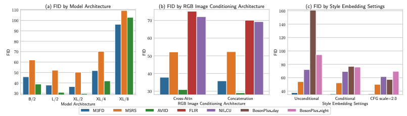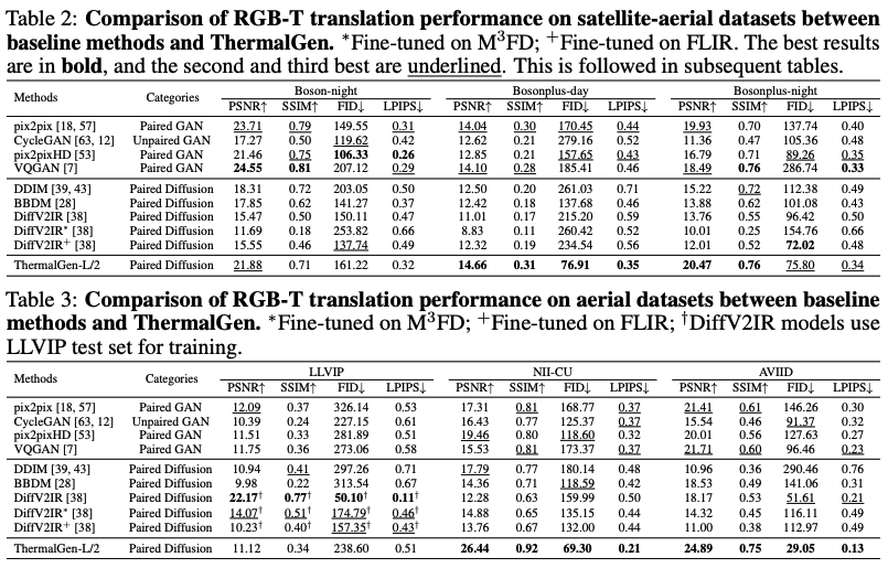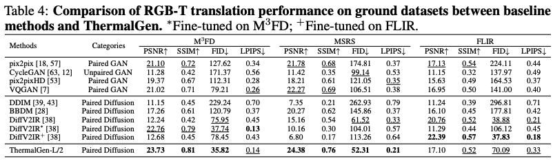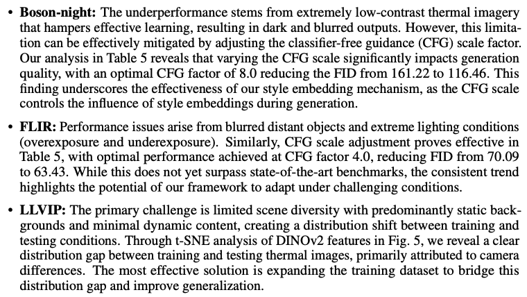 다만… Boson-night 데이터셋에서는 GAN들이 우세함을 보이고 있고, 또한 LLVIP과 FLIR에서도 Diffusion기반에 방법론에 밀리는 것을 볼 수 있습니다. 저자는 일단 여기서는 언급하지 않고 뒤쪽 limiation에서 언급합니다.