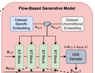 그러면 SiT Block들과 ODE sampler을 통과하여(iteratively하게), noise thermal latent \hat{z_{1, T}}를 다음 timestep \hat{z_{t_{step}, T}}을 얻어낼 수 있습니다. 이 과정을 반복해서, \hat{z_{1, T}}를 \hat{z_{0, T}}으로 만들어줍니다