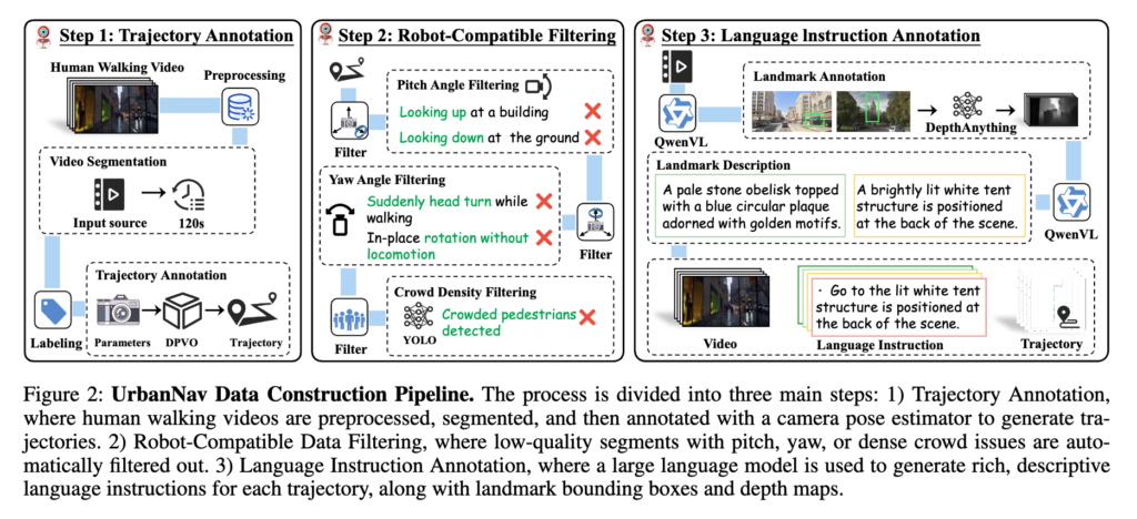 그래서 위 질문에 대한 저자들의 답은 그대로 쓰면 안 되고 robot-compatible filtering이 반드시 필요하고 trajectory와 landmark, instruction을 자동으로 연결해주는 annotation pipeline이 필요하다고 주장합니다. 결국 해덩 논문은 단순히 웹 비디오 많이 끌어 모아서 학습했다가 아니라 로봇에 맞는 데이터만 걸러내고 그 위에 instruction grounding을 얹는 데이터 가공 파이프라인을 설계하고자 합니다.