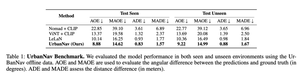 Table 1을 보면 UrbanNav는 seen/unseen 모두에서 가장 좋은 성능을 보입니다. seen이랑 unseen 격차가 크그렇게 크지는 않은데 이부분에 대해서 저자들은 모델이 단순히 훈련 환경의 landmark를 암기했다기보다 어느 정도 instruction-grounded motion prior를 일반화해서 배웠다고 합니다. 물론 이건 offline trajectory error 관점의 이야기이고 실제 real world deployment에서는 다를 수 있다고 생각합니다.