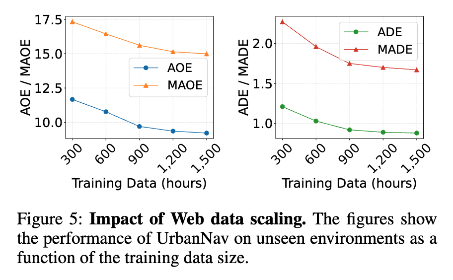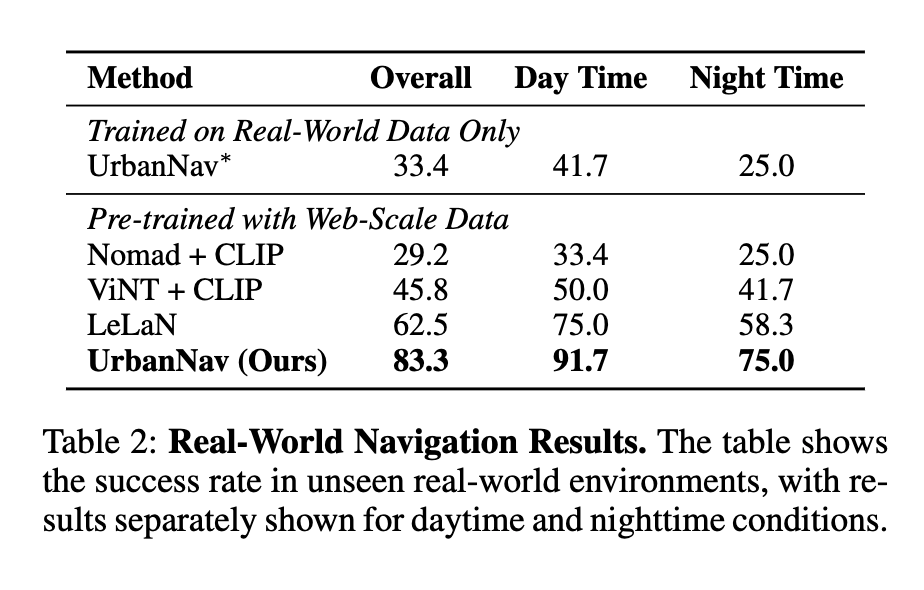여기서 real-world data only로 학습한 UrbanNav가 overall 33.4% 밖에 안나오는데 저자들은 이부분에 대해서 이 모델의 성능은 단순히 architecture가 좋아서가 아니라 web-scale pretraining이 real-world deployment에서의 이점을 보여준다라고 주장합니다.