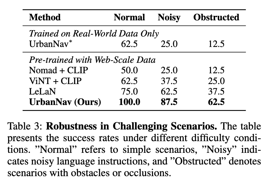Table 3은 normal, noisy, obstructed 세 가지 시나리오로 robustness를 나눠 평가합니다. UrbanNav는 baseline 대비 모두 가장 높은결과를 보입니다. 저자들은 이것도 마찬가지로 web-scale 데이터에 다양한 expression과 landmark description이 들어갔기 때문이라고 주장합니다.