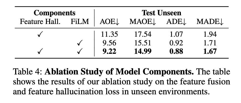 Table 4는 FiLM feature fusion, feature hallucination loss에 대한 ablation 결과 입니다. 둘 다 없는 경우보다 각각 추가될수록 unseen 성능이 좋아지고, 둘 다 함께 있을 때 가장 좋은 결과를 보입니다.