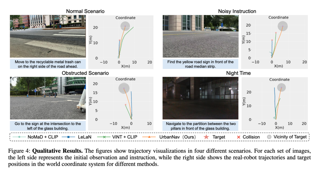 Figure 4는 정성적으로 normal, noisy instruction, obstructed, night time 네 가지 상황에서의 결과를 보여줍니당. UrbanNav는 목표 근처로 비교적 안정적으로 도달하는 반면, baseline들은 instruction을 잘못 해석하거나 collision을 일으키는 경우가 잦았다고 합니다.
